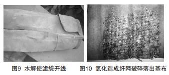水解痕跡為顏色混濁,濾袋強度嚴重下降,易破損。縫紉線發生水解后,濾袋從縫紉線處開裂,使濾袋不再是筒狀。濾袋縫紉線斷裂如圖9。
