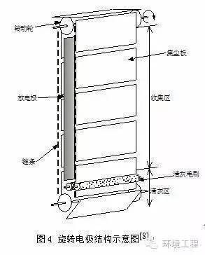 旋轉(zhuǎn)電極式電除塵器與常規(guī)電除塵器的除塵原理完全相同,在清灰方式上有很大改變。旋轉(zhuǎn)電極是由若干個(gè)小塊極板固定在板鏈上低速旋轉(zhuǎn),極板由原來(lái)的整體壓型板改為小塊極板,通過(guò)板鏈帶動(dòng)旋轉(zhuǎn)。其清灰方式采用旋轉(zhuǎn)鋼刷清灰,從根本上改變了常規(guī)電除塵器的振打裝置清灰,徹底避免了振打清灰造成的二次揚(yáng)塵, 同時(shí)也解決了高比電阻粉塵的“反電暈”問(wèn)題。