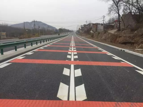 工程路線設(shè)計考慮人、車、路、環(huán)境四大要素,體現(xiàn)了以人為本的差異化設(shè)計理念。項目優(yōu)化調(diào)整了路線指標,沿線除設(shè)置縱向振動標線外,橫向還設(shè)置了更加醒目的紅色振動標線,既提高了車輛行駛的安全性,又提升了標線視覺上的警示功能。