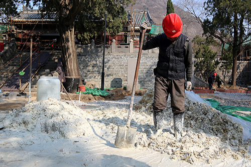 在現(xiàn)場(chǎng)可以看到,冬季過(guò)后,“修煉內(nèi)功”的綜合管線敷設(shè)、地形塑造、受損的磚作石作木作基底清理工作已基本完成,“濕作業(yè)”階段已經(jīng)全面展開(kāi)。目前正在進(jìn)行中的主要工作為建筑屋面的修繕,建筑墻體的修補(bǔ),路面、石階、古磚的清理修復(fù),建筑木構(gòu)件的砍活與重新上漆,木構(gòu)件表面彩繪的清理除塵等工作。