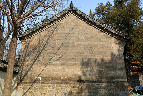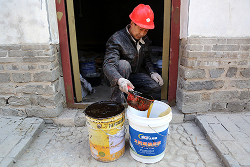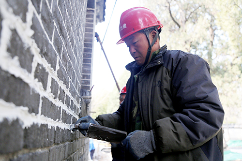 古法之三,磚藥與青磚白灰。在華陽(yáng)宮內(nèi)的古建墻壁上,很多磚塊因?yàn)槟甏眠h(yuǎn)及腐蝕原因,有不同程度的破損,對(duì)墻面破損較輕微的磚塊,以修復(fù)方式,不作替換,具體用水泥、松煙與磚沫制成與墻面顏色一致的磚藥,用磨平與壓死的方式修補(bǔ),還原磚塊原樣。在墻面修補(bǔ)方面,采用青磚白條灰勾縫進(jìn)行處理,恢復(fù)古建筑外貌。據(jù)了解,一位技術(shù)工人一天約能完成高度約50公分的青磚白條灰勾縫修補(bǔ)工作。