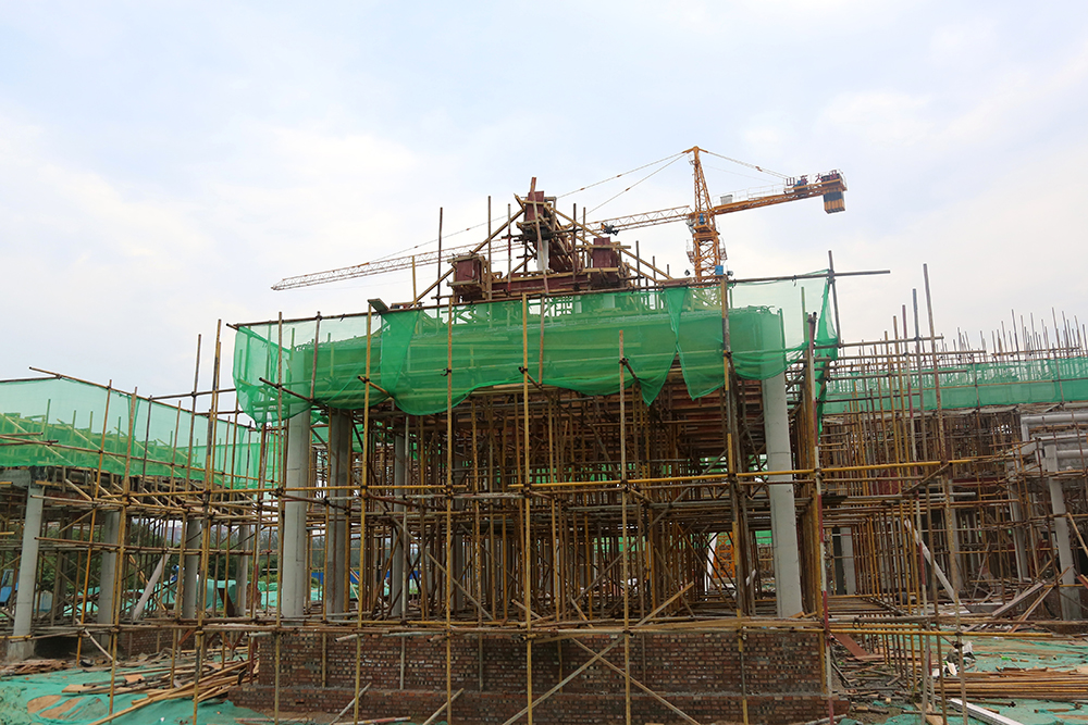 城門樓的工程量最大,項目內(nèi)施工難度最大的是緊靠城門樓的一棟2.5層(局部三層)的中西結(jié)合建筑,該建筑內(nèi)部為錯層結(jié)構(gòu),樓板需要逐層澆筑,同時還有單層挑高8米的高支模(高支模是指支模高度大于或等于5m時的支模作業(yè))作業(yè),施工方案經(jīng)專家反復論證后施行,為保證工期,這棟2.5層的“小建筑”最多80位工人同時施工。同樣,為了整個項目的推進速度,項目高峰作業(yè)期400多位工人同時施工,保證項目按質(zhì)按量推進。
