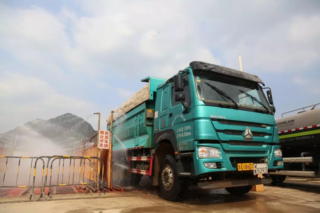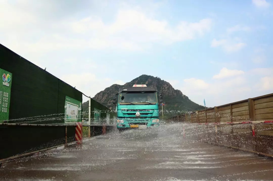 該項(xiàng)目除按照相關(guān)要求安裝自動(dòng)汽車(chē)沖洗平臺(tái)、便道兩側(cè)設(shè)置環(huán)場(chǎng)噴淋、出入口安裝24小時(shí)揚(yáng)塵在線監(jiān)測(cè)和視頻監(jiān)控設(shè)備外,還組織了各參建單位技術(shù)力量,創(chuàng)新開(kāi)發(fā)了不停車(chē)沖洗設(shè)施作為輔助標(biāo)準(zhǔn)化洗車(chē)平臺(tái),以加強(qiáng)沖洗效果。出入口設(shè)置凈車(chē)檢查點(diǎn),對(duì)沖洗不徹底的部位,采用手持高壓水槍進(jìn)行徹底清洗。目前項(xiàng)目的各出入口均已配置2臺(tái)自動(dòng)汽車(chē)沖洗平臺(tái),2臺(tái)高壓水槍和不停車(chē)沖洗設(shè)施。通過(guò)以上措施,實(shí)現(xiàn)施工范圍內(nèi)揚(yáng)塵情況24小時(shí)零死角監(jiān)控,確保外運(yùn)車(chē)輛不帶泥上路。