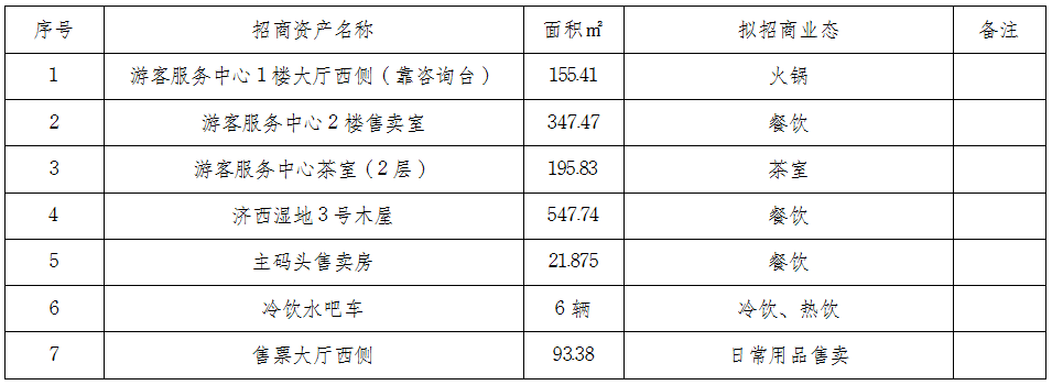 山東濟西國家濕地開園在即,為豐富園區(qū)業(yè)態(tài),現(xiàn)就園區(qū)可經(jīng)營性資產(chǎn)進行公開招商,資產(chǎn)面積及業(yè)態(tài)規(guī)劃如下: