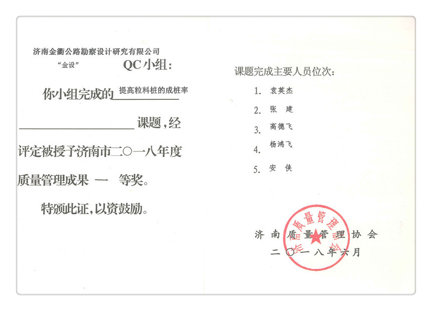 近日,濟南質(zhì)量管理協(xié)會組織召開了2018年度全市群眾性質(zhì)量管理活動經(jīng)驗交流會,表彰群眾性質(zhì)量管理活動中涌現(xiàn)出的優(yōu)秀QC小組、質(zhì)量信得過班組、先進工作者及優(yōu)秀QC成果。金衢公司成立“金設(shè)”QC小組參與評選,申報的多個課題受到表彰:其中“提高粒料樁的成樁率”課題榮獲“濟南市2018年度質(zhì)量管理成果”一等獎;“提高路面結(jié)構(gòu)內(nèi)部排水效率”課題榮獲“濟南市2018年度質(zhì)量管理成果”二等獎;“公路路基滑坡治理研究”、“提高公路設(shè)計工作的效率”、“有效防止小箱梁支座脫空現(xiàn)象”、“提高后期服務(wù)滿意率”四個課題分別榮獲“濟南市2018年度質(zhì)量管理成果”三等獎;同時,金衢公司設(shè)計一室、設(shè)計二室被授予“濟南市2018年度質(zhì)量信得過班組”榮譽稱號,劉騰、王敏、張偉偉三人被授予“2018年濟南市優(yōu)秀質(zhì)量管理工作者稱號”。