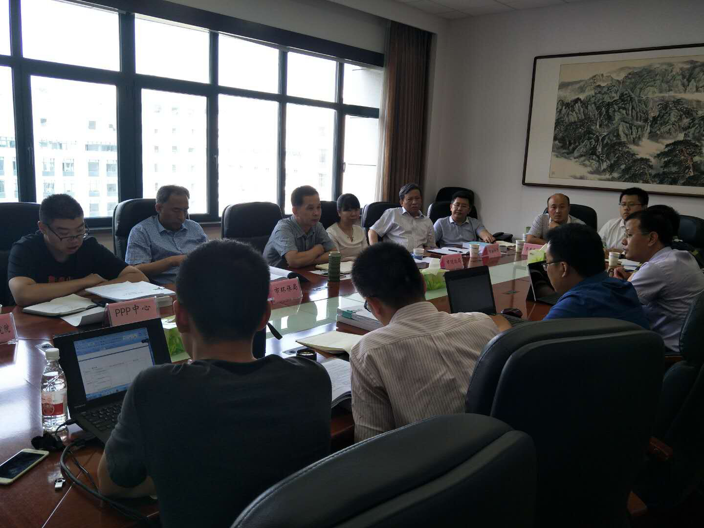 圖一、市城鄉(xiāng)水務(wù)局副巡視員朱丹彤、排水處處長湯啟剛、市財(cái)政、物價(jià)、環(huán)保局等有關(guān)單位與公司總經(jīng)理李少成一同與社會(huì)資本預(yù)中標(biāo)人談判。