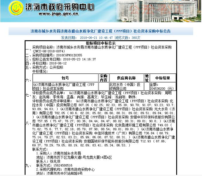 2018年6月14日-22日,按照市城鄉(xiāng)水務(wù)局要求,資產(chǎn)運(yùn)營公司參加臘山水質(zhì)凈化廠ppp項(xiàng)目預(yù)中標(biāo)社會(huì)資本談判會(huì),按照政府采購中心要求與前三名中標(biāo)人進(jìn)行會(huì)談,按程序最終確定成績第一名的北控水務(wù)(中國)投資有限公司中標(biāo)。21日濟(jì)南市政府采購中心開始進(jìn)行中標(biāo)公示,22日資產(chǎn)運(yùn)營召專題研究會(huì),與北控水務(wù)就合作協(xié)議、公司章程相關(guān)內(nèi)容與條款進(jìn)行討論,研究部署組建ppp公司相關(guān)工作,倒排工期,壓茬推進(jìn)各項(xiàng)前期工作。