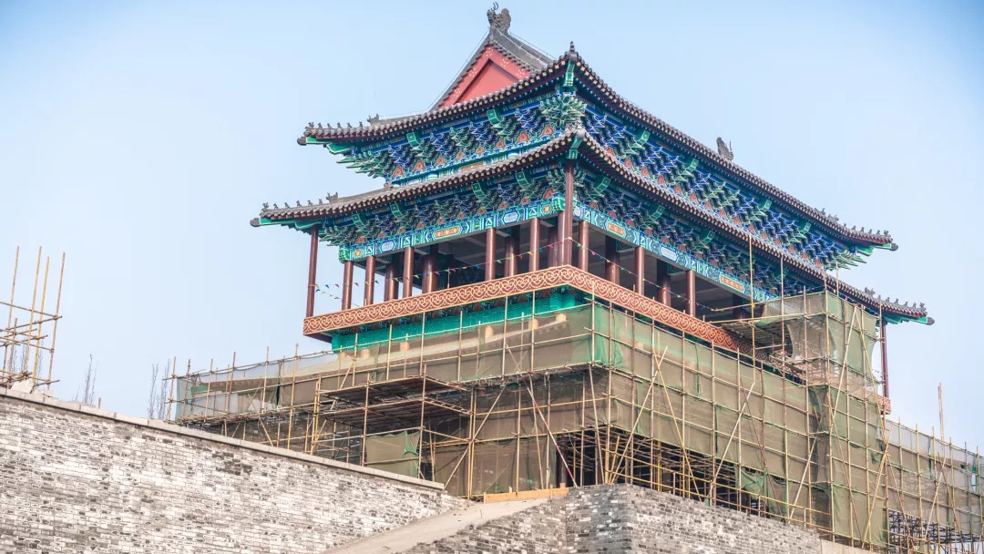 項(xiàng)目所有建筑中,最具標(biāo)志性的當(dāng)屬城門樓,同時(shí),這也是項(xiàng)目內(nèi)工程量最大、工期最長的單體建筑。其中城墻高度為8.7米,城門樓最頂端高度為29.5米。僅城門樓施工使用的鋼管就已達(dá)20萬米,占整個(gè)項(xiàng)目鋼管消耗量的近一半,從基礎(chǔ)施工到主體完工,耗時(shí)近4個(gè)月。城門樓的彩繪部分采用的是旋子彩繪形式,用或圓潤飽滿、或流暢柔韌的各色線條旋轉(zhuǎn)盤結(jié)而成,最大的特點(diǎn)是在藻頭內(nèi)使用了帶卷渦紋的花瓣,旋子常用于殿式彩畫,既素雅又華美。