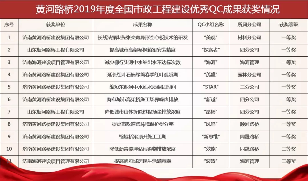 濟(jì)南黃河路橋建設(shè)集團(tuán)有限公司共有11項(xiàng)成果參與發(fā)布,其中9項(xiàng)成果榮獲一等獎(jiǎng),2項(xiàng)成果榮獲二等獎(jiǎng);同時(shí)黃河路橋建設(shè)集團(tuán)被評(píng)為2019年“全國(guó)市政工程建設(shè)QC小組活動(dòng)優(yōu)秀企業(yè)”,這是自2013年以來連續(xù)七年獲得此項(xiàng)殊榮。
