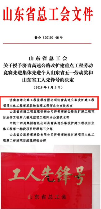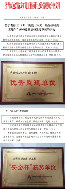 近日,由濟南城市建設集團所屬濟南金諾公路工程監(jiān)理有限公司承建的濟青高速第五駐地辦榮獲2019年山東省總工會“工人先鋒號”榮譽稱號, 同時,在2019年度該項目“決戰(zhàn)100天,確保按時交工通車”勞動競賽活動中表現突出,榮獲2019年濟青高速改擴建工程“優(yōu)秀監(jiān)理單位”、“安全杯”獲獎單位榮譽稱號;其中,項目負責人獲得“優(yōu)秀駐地監(jiān)理工程師”稱號, 6位同志獲得“監(jiān)理單位先進個人”稱號, 2位同志獲得“監(jiān)理單位安全生產先進個人” 稱號,共獲得專項獎勵49.6萬元。