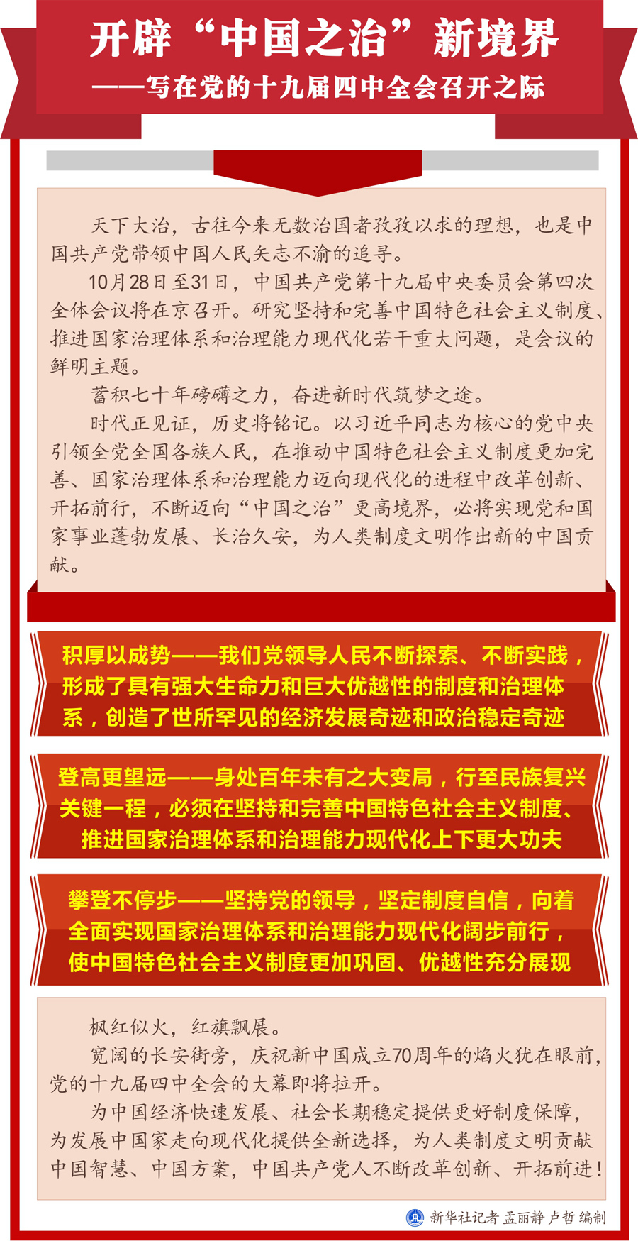 10月28日至31日,中國(guó)共產(chǎn)黨第十九屆中央委員會(huì)第四次全體會(huì)議將在京召開。研究堅(jiān)持和完善中國(guó)特色社會(huì)主義制度、推進(jìn)國(guó)家治理體系和治理能力現(xiàn)代化若干重大問題,是會(huì)議的鮮明主題。