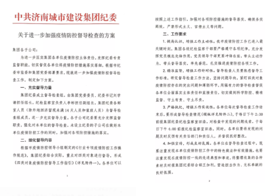 疫情就是命令,防控就是責(zé)任。濟(jì)南城市建設(shè)集團(tuán)把疫情防控作為當(dāng)前最重要的政治任務(wù)來(lái)抓,按照中央、省、市委關(guān)于做好新型冠狀病毒肺炎疫情防控的部署和要求,快速響應(yīng),迅速部署,采取有力措施,注重黨委、紀(jì)委兩個(gè)責(zé)任的協(xié)同配合,深化一線督導(dǎo)檢查,以最堅(jiān)決的態(tài)度、最嚴(yán)格的執(zhí)行、最果斷的行動(dòng),全力以赴推動(dòng)疫情防控責(zé)任落實(shí)。