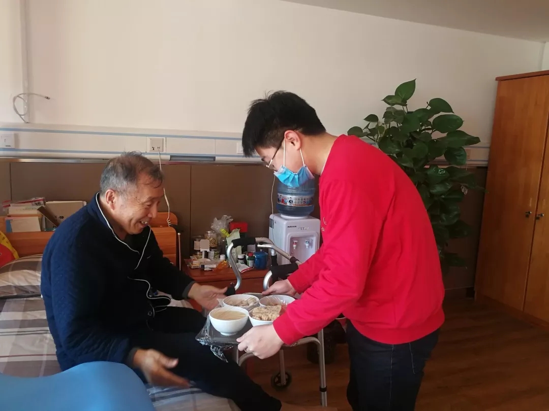 在介護區(qū),我們還看到了兩位正在忙碌的“95后”小伙子。97年出生的陳安義,家住德州,本來已經(jīng)買好了回家的車票,接到抗擊疫情的通知,第一時間退了車票主動請戰(zhàn)。98年出生的欒希浩,老家在煙臺,也是放棄了春節(jié)假期,跟陳安義兩人共同負責介護區(qū)二樓的四戶長者。