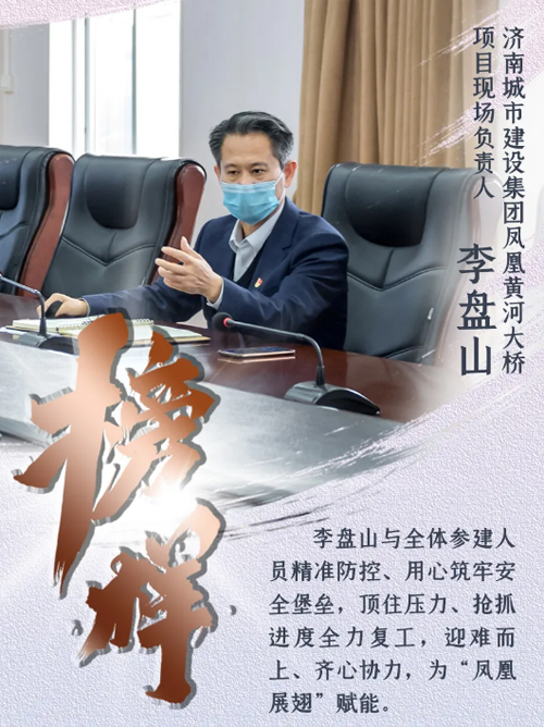 陽(yáng)春三月,兩岸新綠。鳳凰黃河大橋施工現(xiàn)場(chǎng),各施工區(qū)域熱火朝天、作業(yè)正忙。自項(xiàng)目全面復(fù)工以來,1000多名工人日夜奮戰(zhàn)一線,在做好疫情防控工作基礎(chǔ)上,項(xiàng)目建設(shè)各項(xiàng)工作全速推進(jìn)。作為濟(jì)南城市建設(shè)集團(tuán)鳳凰黃河大橋項(xiàng)目現(xiàn)場(chǎng)負(fù)責(zé)人,李盤山與全體參建人員精準(zhǔn)防控、用心筑牢安全堡壘,頂住壓力、搶抓進(jìn)度全力復(fù)工,迎難而上、齊心協(xié)力,為“鳳凰展翅”賦能。