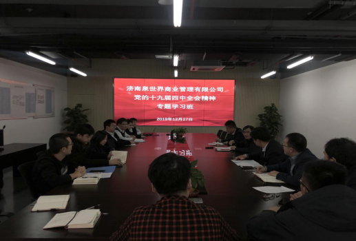 遵照濟(jì)南城市建設(shè)集團(tuán)黨委安排部署,為進(jìn)一步學(xué)習(xí)宣傳貫徹黨的十九屆四中全會精神,加深對全會精神的了解掌握,提高運用黨的理論成果推動工作的能力,確保園區(qū)各項工作落到實處,公司于2019年12月份下旬安排三天下午,在印象濟(jì)南園區(qū)會議室由總經(jīng)理宋光華同志主持召開黨的第十九屆四中全會精神的專題學(xué)習(xí)。