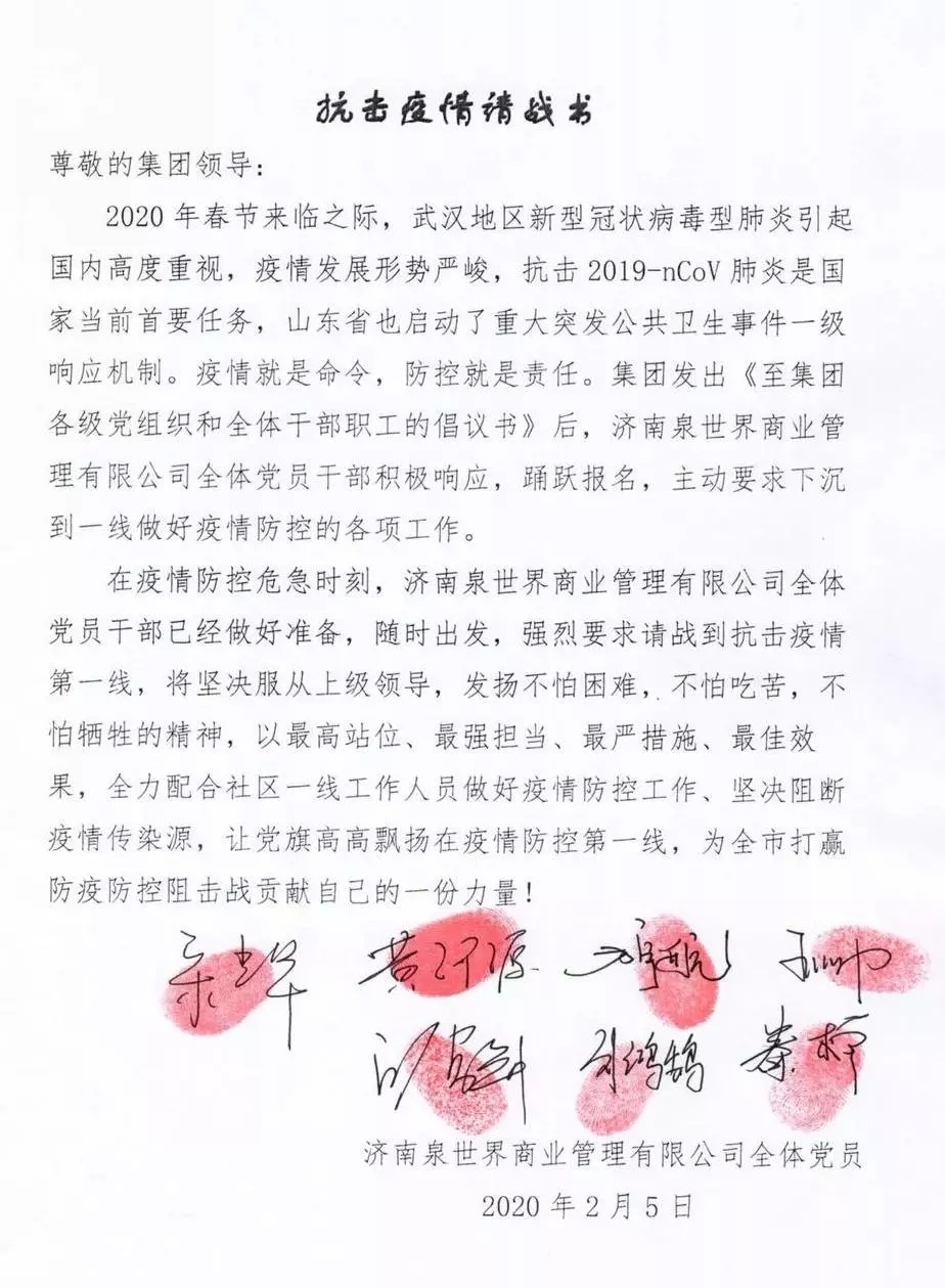 在接到集團(tuán)通知后,泉世界商管公司高度重視,立刻組織公司黨員開(kāi)會(huì)學(xué)習(xí)集團(tuán)指示,部署工作任務(wù)。印象濟(jì)南·泉世界執(zhí)行董事兼總經(jīng)理宋光華率先垂范帶頭報(bào)名,公司全體黨員干部第一時(shí)間積極響應(yīng),踴躍報(bào)名,主動(dòng)要求下沉到一線做好疫情防控的各項(xiàng)工作,以實(shí)際行動(dòng)守初心、擔(dān)使命,為打贏疫情防控阻擊戰(zhàn)作出新的更大貢獻(xiàn)!最終,公司7名黨員干部全部報(bào)名請(qǐng)求到抗擊疫情一線工作,并在《抗擊疫情請(qǐng)戰(zhàn)書》上簽字按手印。