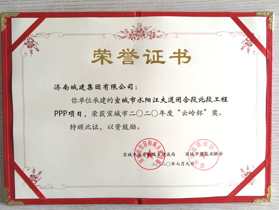 近日,由集團(tuán)所屬濟(jì)南城建集團(tuán)有限公司承建的宣城市水陽江大道閉合段北段工程PPP項(xiàng)目、宛陵東路(拱極路—宛溪北路)工程榮獲宣城市2020年度“云嶺杯”獎。