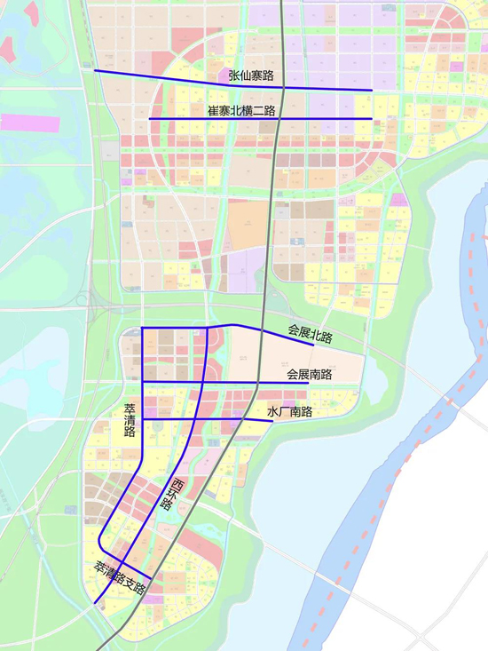 崔寨組團(tuán):萃清路支路、水廠南路、會展南路、會展北路、崔寨北橫二路、張仙寨路、萃清路、西環(huán)路。