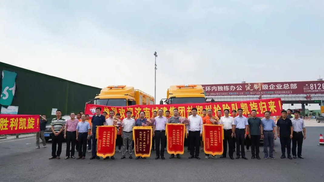 7月25日一早,城建集團(tuán)公司應(yīng)急搶險隊(duì)經(jīng)過休整準(zhǔn)備返濟(jì)時,鄭州惠濟(jì)區(qū)老百姓自發(fā)來到現(xiàn)場,為救援隊(duì)員們送上鮮花、食品等禮物,拉起“歡送山東省住建廳救援隊(duì)英雄們平安回家”“向搶險救災(zāi)的英雄致敬”的條幅,夾道歡送應(yīng)急救援隊(duì)。