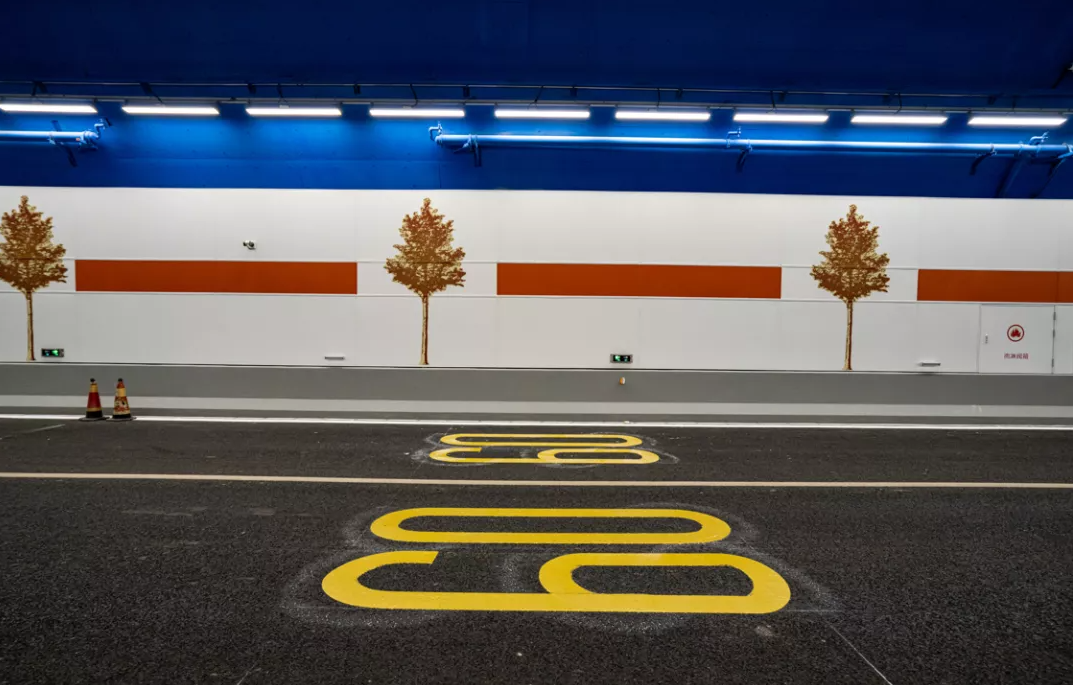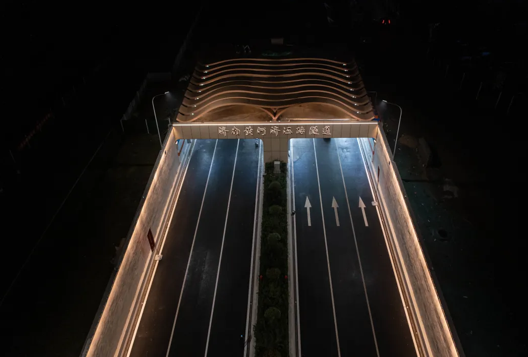 保持隧道主體工程結(jié)構(gòu)不變,通過增加裝飾,實現(xiàn)整體設(shè)計提升。隧道南北出口聲屏障以“歲歲九曲彎”和“歲歲安瀾”為設(shè)計主題,以中國傳統(tǒng)裝飾紋樣呈現(xiàn),夜晚還將呈現(xiàn)“日出黃河”的燈光效果。添加“流動”與“水紋”的造型體現(xiàn)了黃河穿越之美,在隧道內(nèi)采用3D打印貼膜工藝?yán)L制白楊樹(寓意堅韌、表達(dá)力求上進(jìn)的精神),以緩解駕駛員視覺疲勞。同時以黃河星空為題,中間段頂部弧線的燈光表現(xiàn)黃河穿越之感,暖色照明設(shè)計表現(xiàn),感受黃河星空光線流動之美。