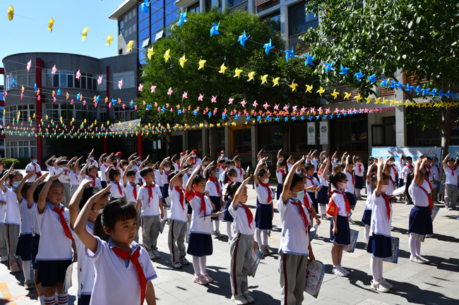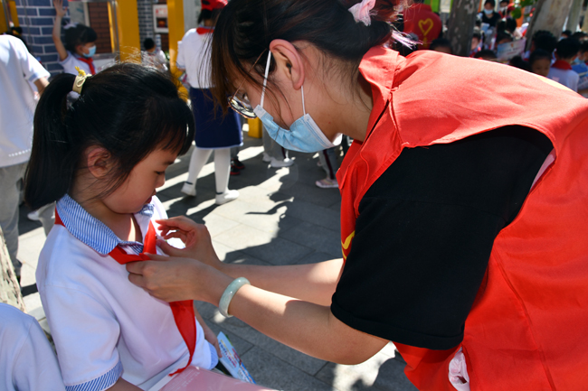 活動(dòng)中,志愿者身著紅色志愿者馬甲,與小朋友們進(jìn)行親密互動(dòng),為孩子們佩戴少先隊(duì)隊(duì)徽,以通俗易懂的方式為大家講解少先隊(duì)知識(shí)、安全防疫知識(shí),提醒提高安全防護(hù)意識(shí)。志愿者們與小朋友們有說有笑,其樂融融,為小朋友們送去集團(tuán)的關(guān)愛和祝福,祝愿孩子們開心快樂成長(zhǎng)。孩子們用整齊的少先隊(duì)禮回應(yīng)志愿者,稚嫩的童顏上洋溢著燦爛的笑容。
