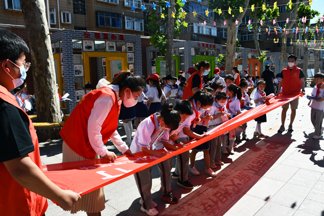 活動(dòng)最后,小朋友們?cè)?ldquo;以團(tuán)帶隊(duì) 薪火相傳 安全‘童 ’行 ”的條幅上簽上自己的名字,胸帶少先隊(duì)徽,一筆一畫的認(rèn)真書寫,鮮艷的紅色條幅映紅了孩子們的臉龐,在孩子心中播種下美好的種子。