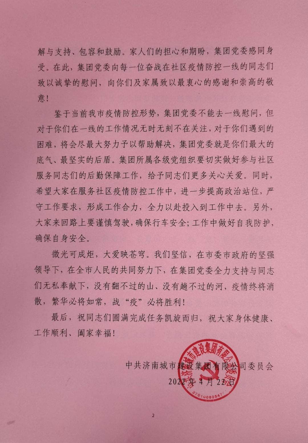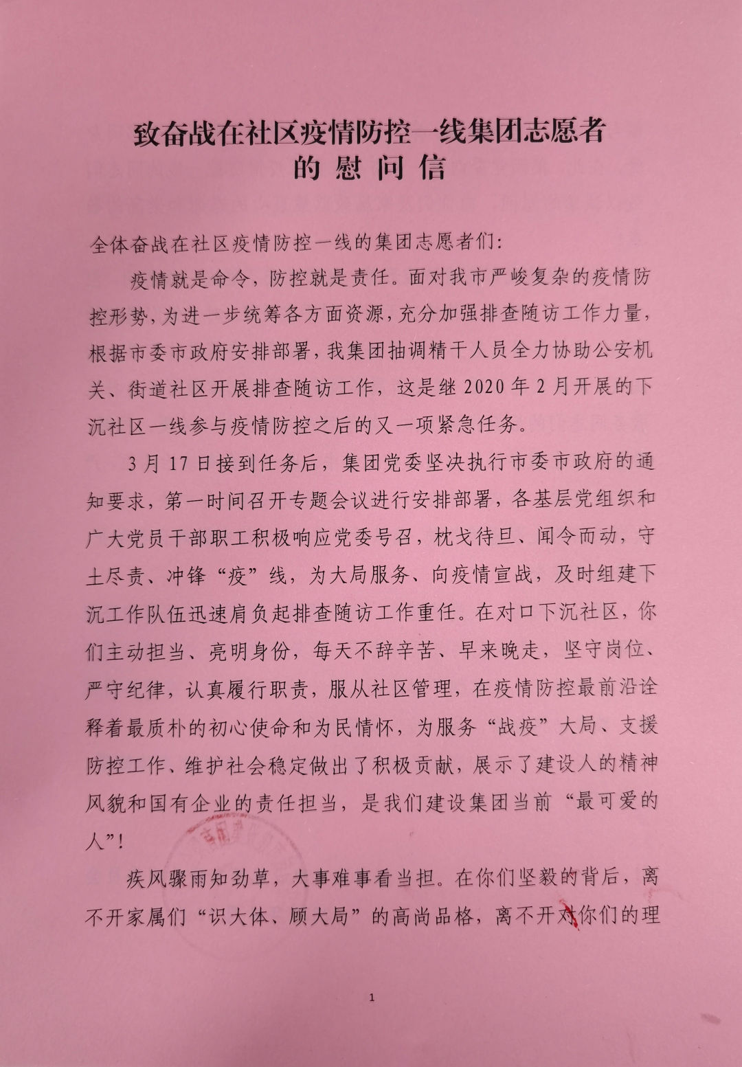 鑒于當(dāng)前我市疫情防控形勢,集團(tuán)黨委不能去一線慰問,但對于你們在一線的工作情況無時無刻不在關(guān)注,對于你們遇到的困難,將會盡最大努力予以幫助解決,集團(tuán)黨委就是你們最大的底氣、最堅實的后盾。集團(tuán)所屬各級黨組織要切實做好參與社區(qū)服務(wù)同志們的后勤保障工作,給予同志們更多關(guān)心關(guān)愛。同時,希望大家在服務(wù)社區(qū)疫情防控工作中,進(jìn)一步提高政治站位,嚴(yán)守工作要求,形成工作合力,全力以赴投入到工作中去。另外,大家來回路上要謹(jǐn)慎駕駛,確保行車安全;工作中做好自我防護(hù),確保自身安全。