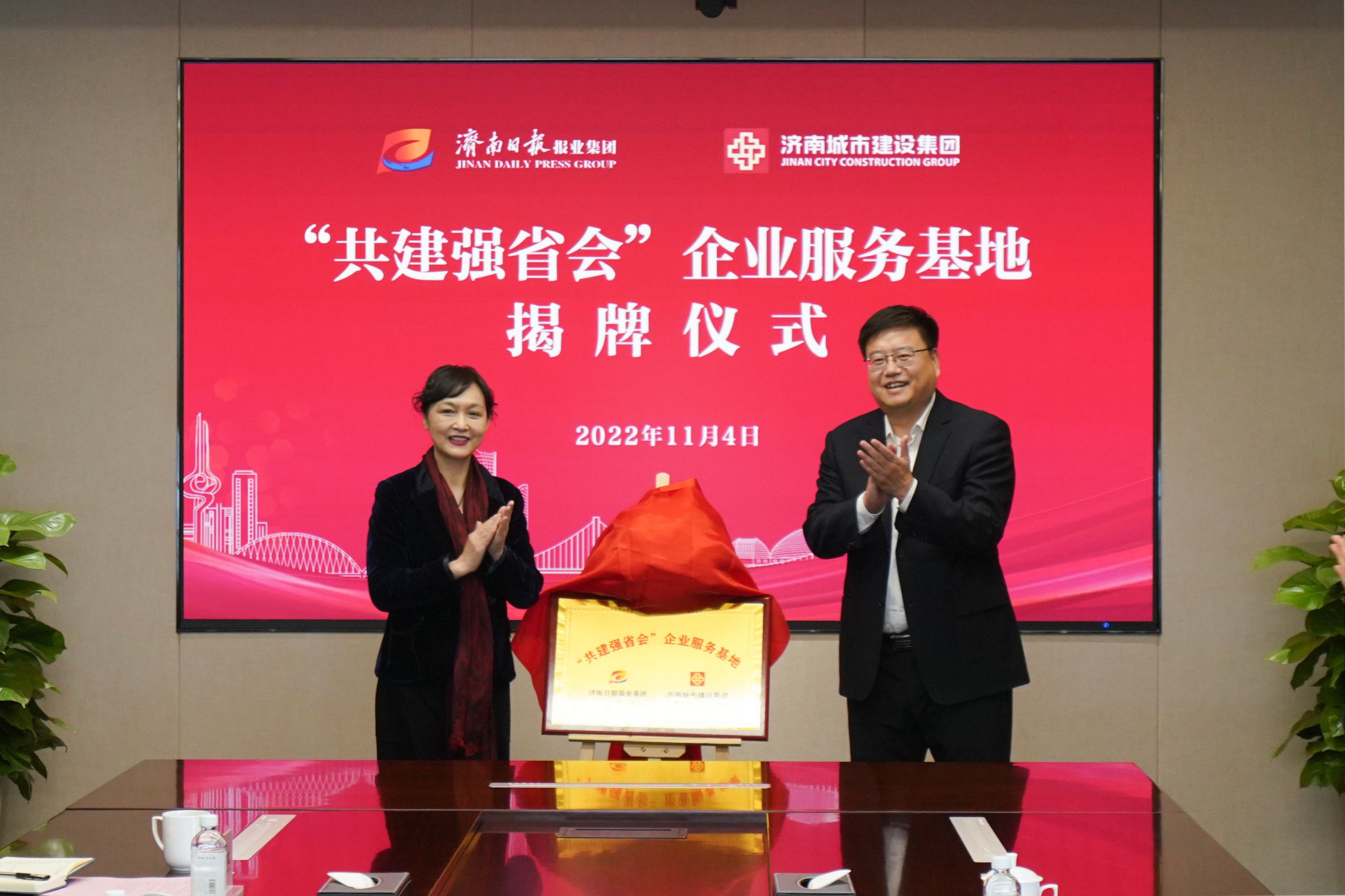 馬利、史海成同志共同為濟(jì)南日報(bào)報(bào)業(yè)集團(tuán)、濟(jì)南城市建設(shè)集團(tuán)“共建強(qiáng)省會”企業(yè)服務(wù)基地揭牌。