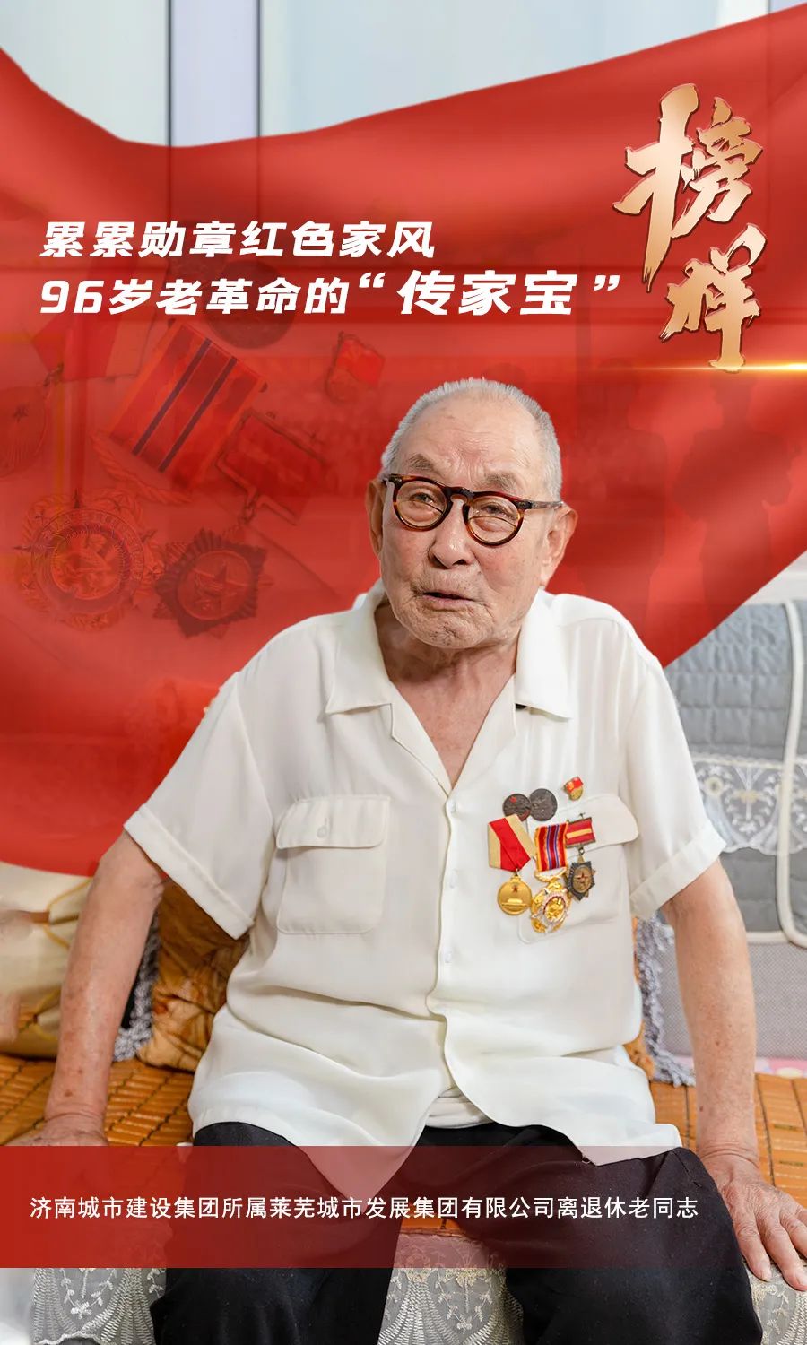1946年參軍,1948年入黨,參加過(guò)濟(jì)南戰(zhàn)役、淮海戰(zhàn)役、渡江戰(zhàn)役、上海戰(zhàn)役、抗美援朝,并多次榮立戰(zhàn)功……在濟(jì)南城市建設(shè)集團(tuán)所屬萊蕪城市發(fā)展集團(tuán)有限公司的離退休老同志中,有這樣一位勛章累累的96歲老革命——戴風(fēng)樓。他謙虛勤懇、艱苦樸素,幾十年革命及工作生涯堅(jiān)定感黨恩、跟黨走;他以身作則、家風(fēng)清正,紅色基因在家庭中、在工作崗位上代代傳承。