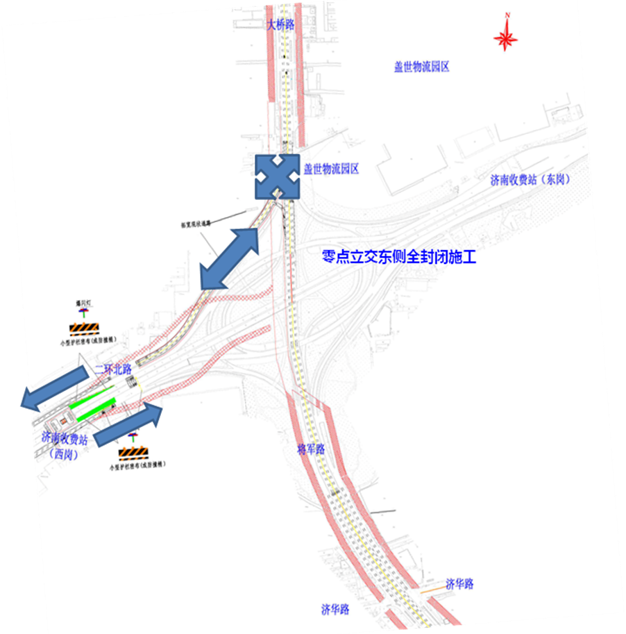 在此期間,零點(diǎn)立交橋下的大橋路南北向及G35濟(jì)廣高速主線東西向車輛正常通行。二環(huán)北路由西向東前往零點(diǎn)立交以北的左轉(zhuǎn)車輛,需通過零點(diǎn)立交橋西北象限擴(kuò)建現(xiàn)狀道路與大橋路交叉口(現(xiàn)狀燈控口)進(jìn)行交通轉(zhuǎn)換。其它車輛均需通過外圍相關(guān)道路繞行。