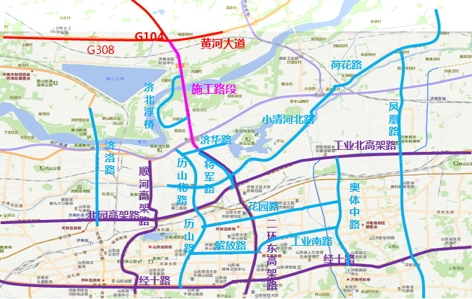 市區(qū)過路車輛可通過各城市快速路、干線道路繞行,經(jīng)濟(jì)濼路隧道、濟(jì)南黃河鳳凰大橋、濟(jì)南建邦黃河大橋等道路向北跨越黃河。