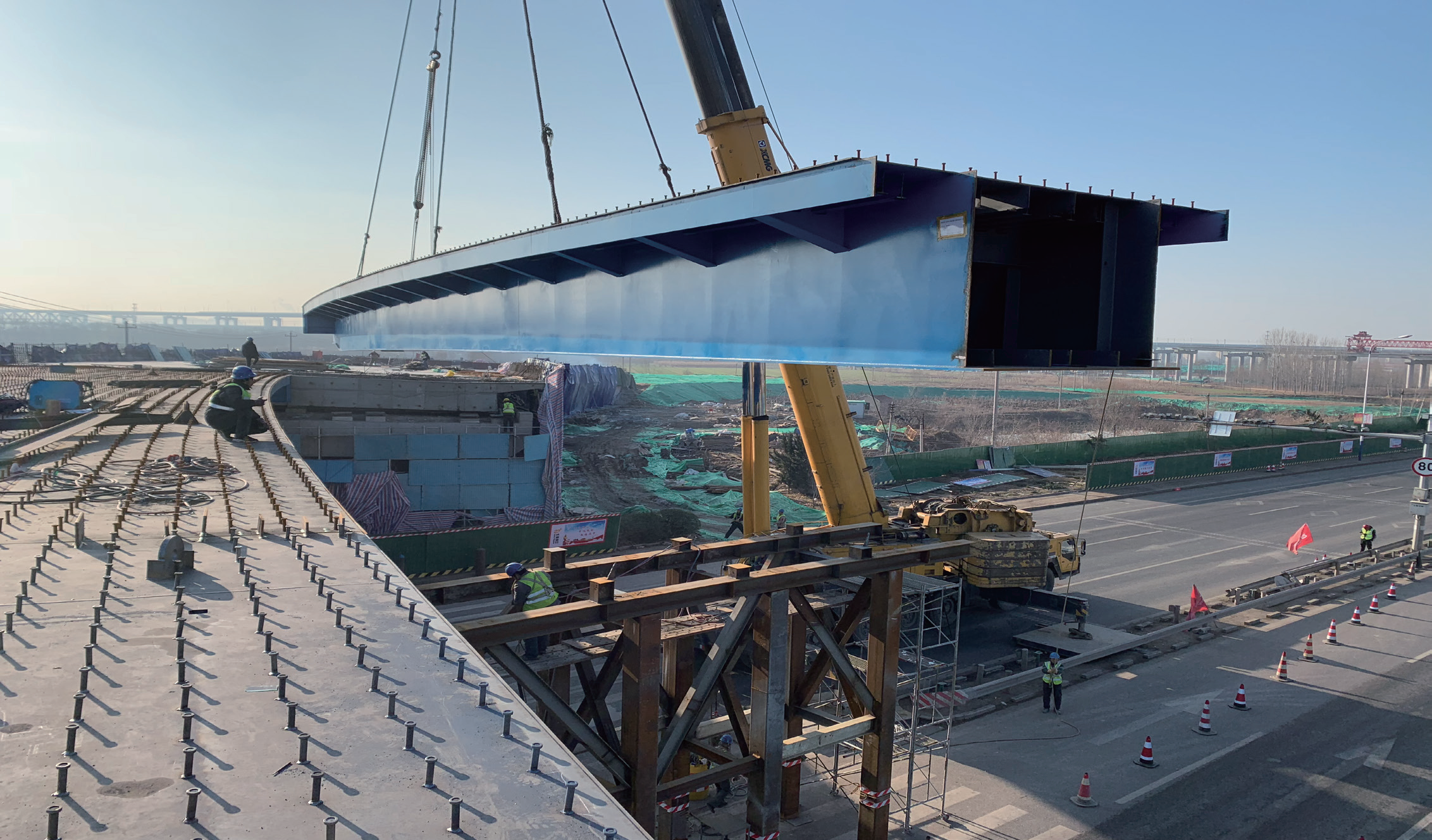 該項目“三跨青銀,兩跨濟青”,工程起點3次跨越青銀高速,工程終點2次跨越濟青高速,所有跨越都在不中斷交通的情況下進行的。在施工過程中,把重達140噸的箱梁整體跨越,對工藝、技術(shù)、安全等都有極高的要求。項目部先后組織召開四次專家論證會,對多個方案進行比選,形成最優(yōu)方案,提前24天完成G220鋼箱梁吊裝施工,未出現(xiàn)任何安全問題。在鋼橋橋面施工中采用了澆筑式瀝青混凝土鋪裝,有效延長了橋梁主體和路面的使用壽命,降低了養(yǎng)護、維修和管理費用。道路伸縮縫口設(shè)計成S波浪型,有效吸收車輛輪胎的沖擊動能,降低噪聲,提高行車舒適度。