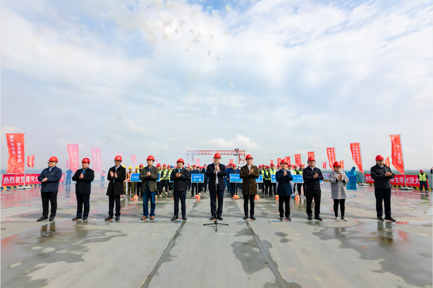 4月28日上午,由濟南城市建設集團負責建設的濟南黃河公路大橋工程主塔順利封頂,較原計劃工期提前5個月實現(xiàn)關(guān)鍵性重大控制節(jié)點突破,為大橋項目建成通車奠定堅實基礎。市委主題教育第十七巡回指導組組長楊長軍及指導組成員觀摩指導,建設集團黨委書記、董事長史海成宣布封頂,黨委副書記、總經(jīng)理許為民,集團總經(jīng)理助理、安全總監(jiān)解漢忠參加活動。