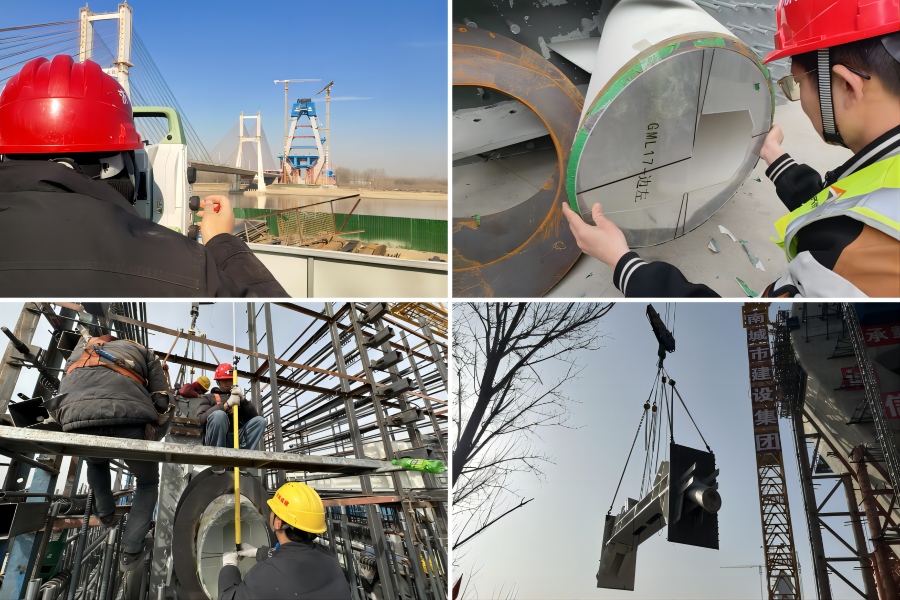 主塔上塔柱鋼錨梁共17對,單個最大重量9.3噸,索導管長度最大達5.4米。項目部根據(jù)導管尺寸,專門設計定制管口測量工裝,在鋼錨梁吊裝前安裝定位工裝,實現(xiàn)吊裝動態(tài)觀測,將“隱形點”可視化,保證了預埋準確度,大幅提升施工作業(yè)工效。