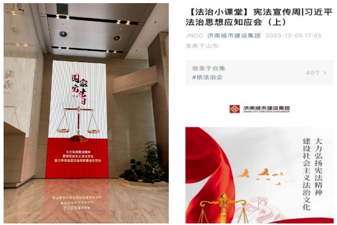 12月5日,濟南城建集團公司組織員工收看專題節(jié)目“憲法的精神法治的力量——2023年度法治人物頒獎典禮”,開展了憲法知識競賽等活動。公司將以此次活動為契機,引導廣大干部職工掌握基本法律知識,提高自身法律素質,營造一個人人學法律、懂法律、用法律的良好氛圍。