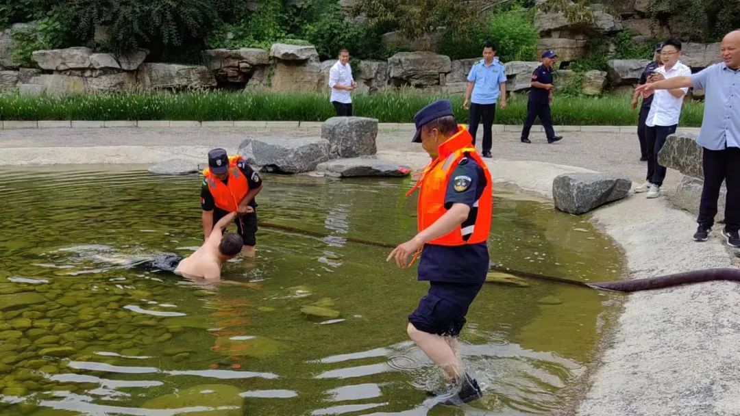 防溺水應(yīng)急演練模擬北臥牛山公園因連續(xù)降雨造成月牙灣水位快速上漲,發(fā)生游客被困溺水事件,設(shè)置月牙灣入口處沙袋封堵洪水、道路封閉警戒、緊急排水、救助溺水游客等科目,演練了游客被困、防汛物資儲(chǔ)備、緊急救助等各項(xiàng)險(xiǎn)情的處置方案。