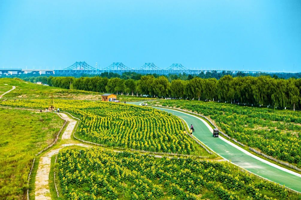 直接導(dǎo)航“濟(jì)南黃河大橋”,過(guò)橋后立即右轉(zhuǎn),沿著黃河北大堤繼續(xù)向前直行2-3公里,道路左邊就能看到大片的花海。
