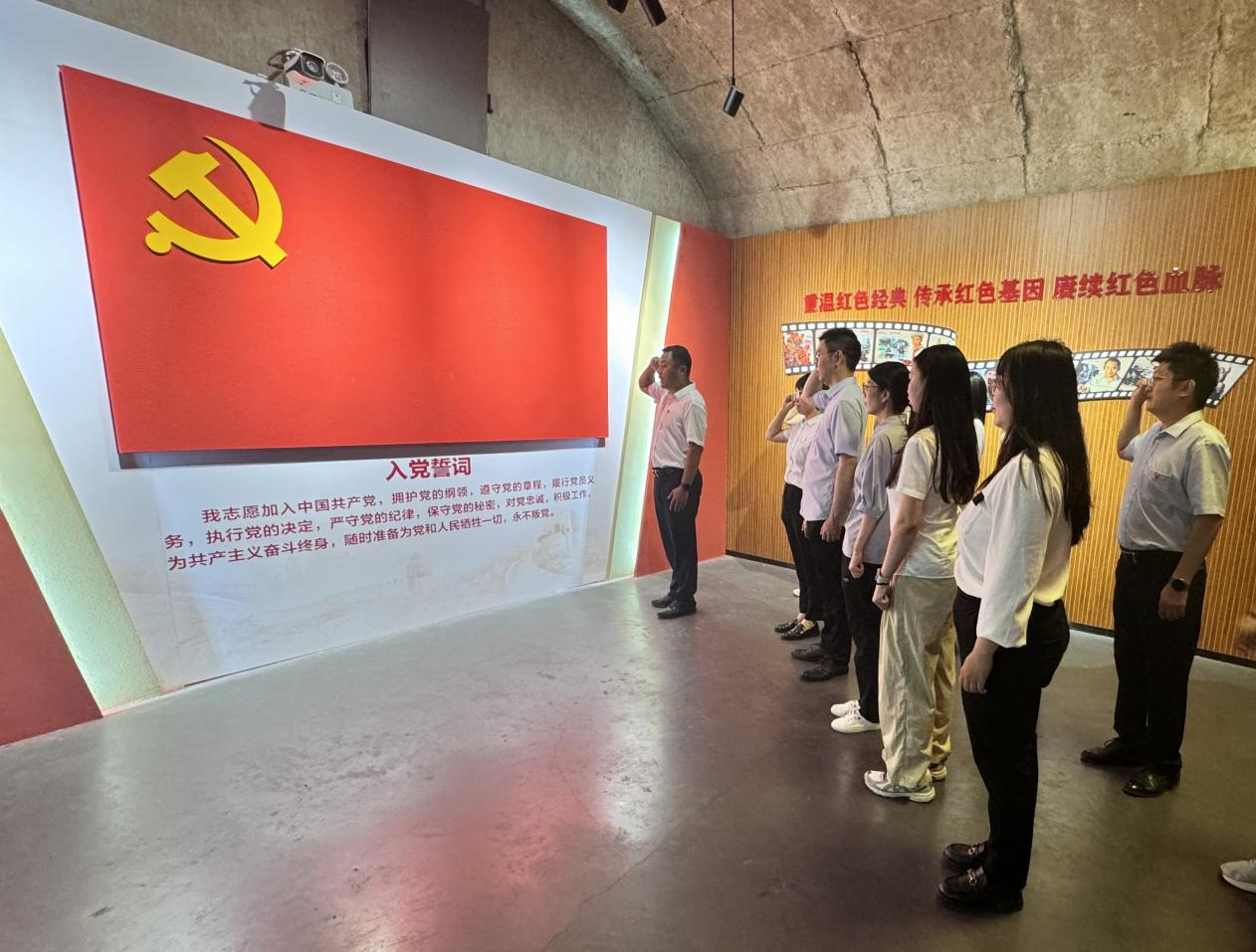 在紅色文化教育和國(guó)防知識(shí)普及長(zhǎng)廊,大家學(xué)習(xí)了黨的一大到二十大的百年奮斗歷程,了解了泉城人民防空建設(shè)歷史。隨后,大家莊嚴(yán)宣誓,重溫入黨誓詞。