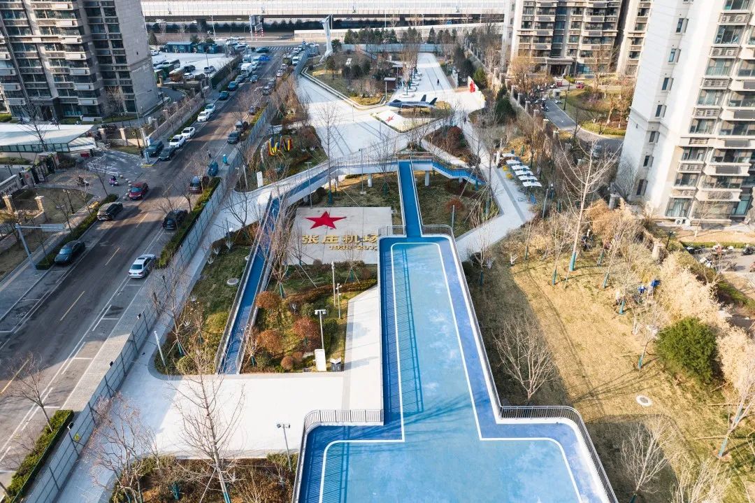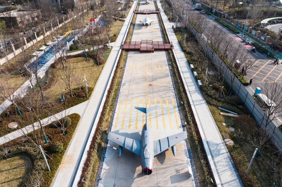 公園南區(qū)入口打造文化長廊,通過展示中國戰(zhàn)機發(fā)展史讓市民了解空軍文化;結(jié)合原有170米長水泥跑道,通過景觀手法進(jìn)行二次設(shè)計,融合機場跑道符號、導(dǎo)航等設(shè)施還原機場跑道場景,沿跑道科普展示曾在張莊機場服役的戰(zhàn)機模型,進(jìn)行航空科普、國防軍事及愛國主義教育。